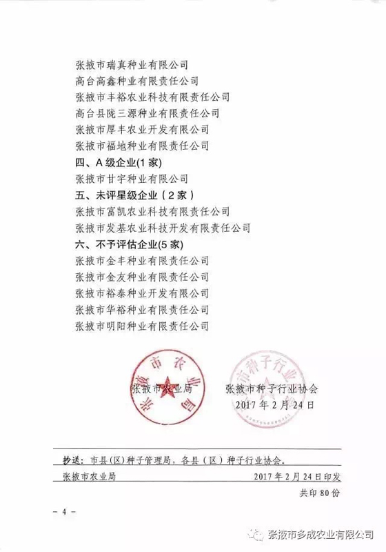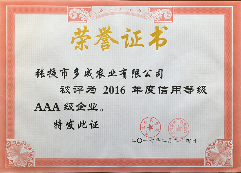 | 熱烈祝賀張掖市多成農業(yè)有限公司被評為2017年度信用等級AAA級企業(yè)! | ||