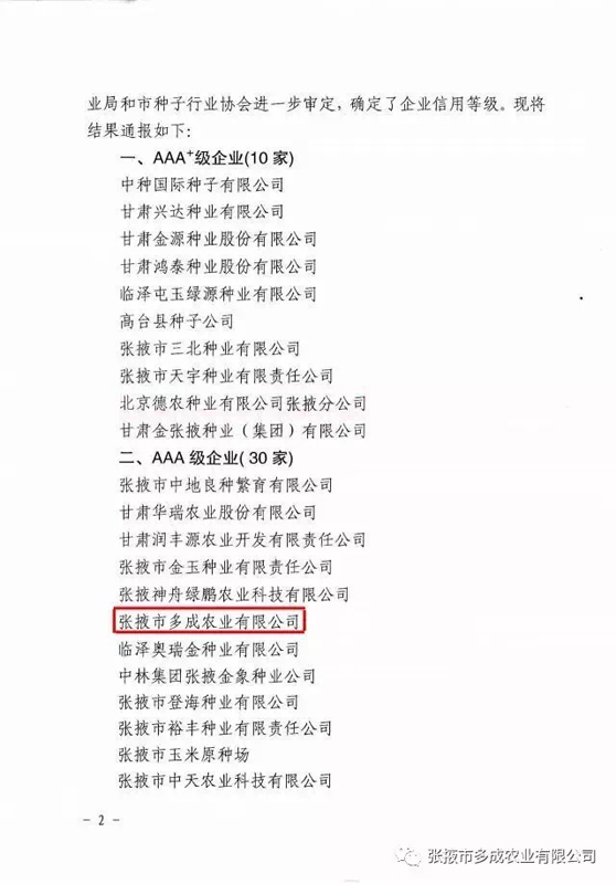 熱烈祝賀張掖市多成農業(yè)有限公司被評為2017年度信用等級AAA級企業(yè)! 2017年2月24日,張掖市農業(yè)局、張掖市種子行業(yè)協(xié)會公布的《2016年度玉米種子企業(yè)信用等級評估結果》中,張掖市多成農業(yè)有限公司被評為2016年度信用等級AAA級企業(yè)。 |
